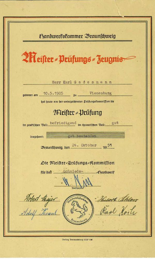- 1925 Gegründet als Schmiede von Karl Gadesmann in der Radaustraße in Vienenburg